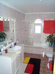Obergeschoss: drei Schlafzimmer, wovon zwei für spanische Verhältnisse sehr gross sind, (ca. 25 qm), eines davon mit Zugang zu einer uneinsehbaren Terrasse von ca. 10 qm, zwei Bäder, davon eines en suite, die ebenfalls sehr großzügig gestaltet wurden. Eine nagelneue Gas-Zentralheizung mit separatem Warmwasserboiler wurde im Januar 2004 installiert. Sat-Anschluß für 2 Fernseher vorhanden. Das Haus verfügt über eine Zisterne und ist am öffentlichen Kanal angeschlossen.